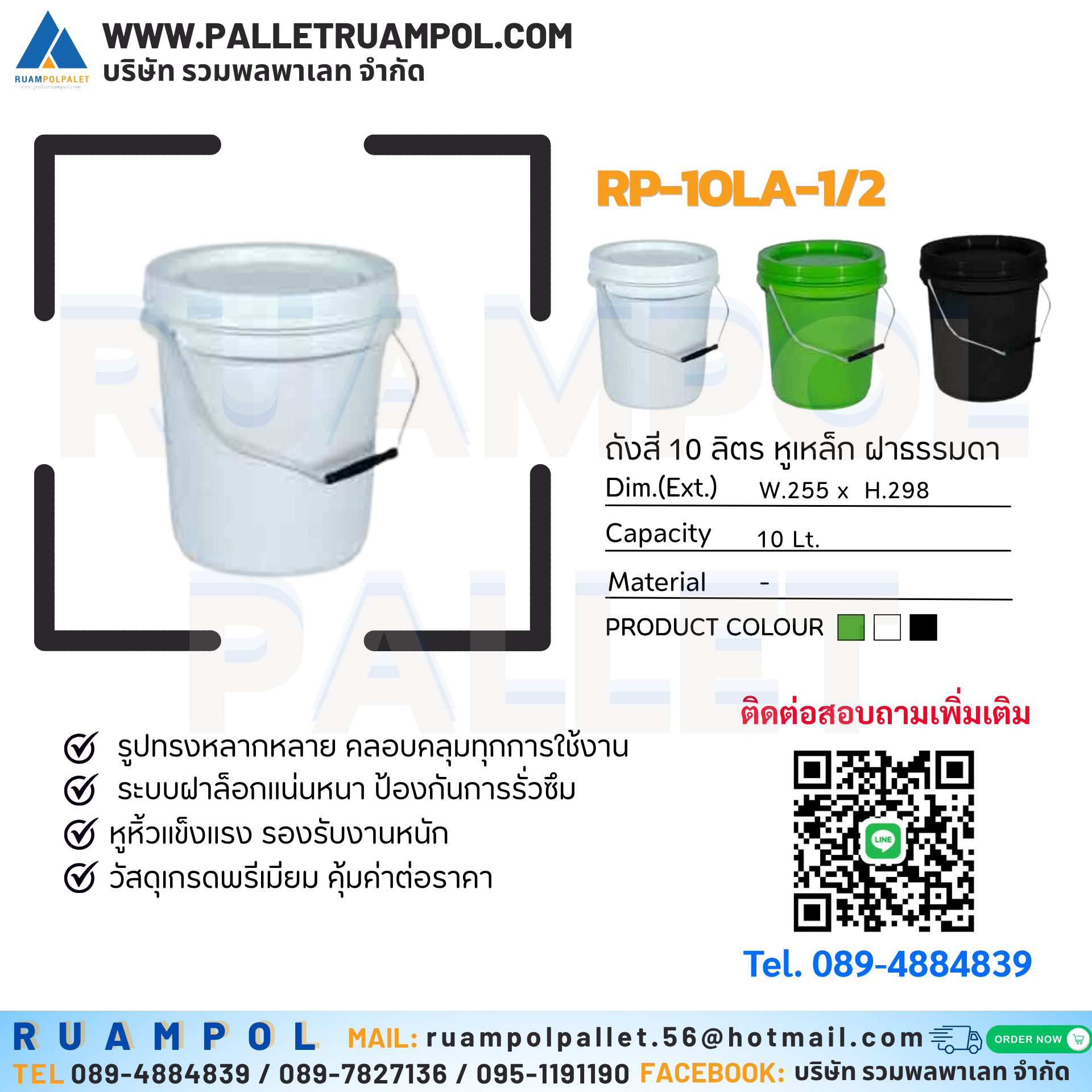 ถังสี 10 ลิตร หูเหล็ก ฝาธรรมดา รหัสสินค้า : RP-10LA-1/2